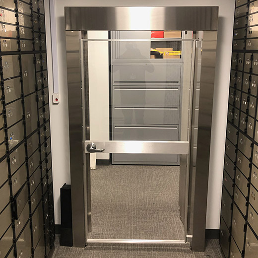 DN Daygate uses a standard key locking lever style handle on the outside and just a lever handle on the inside with no keylock. This eliminates any problems with municipal fire codes that do not allow a key to be used to exit from inside the vault.